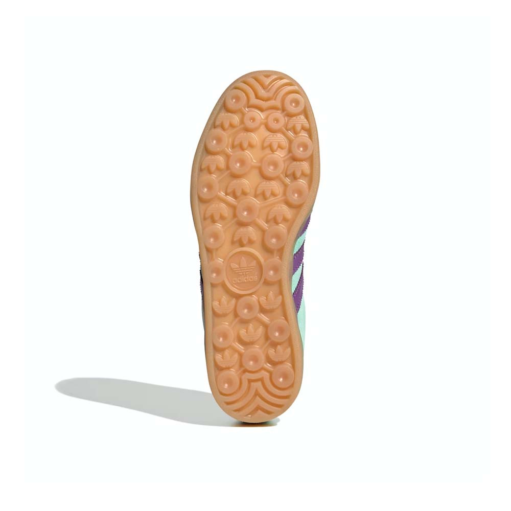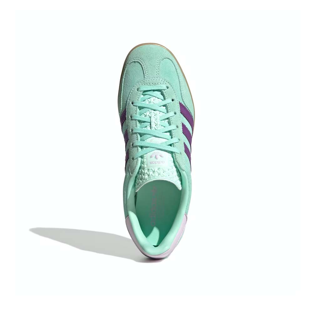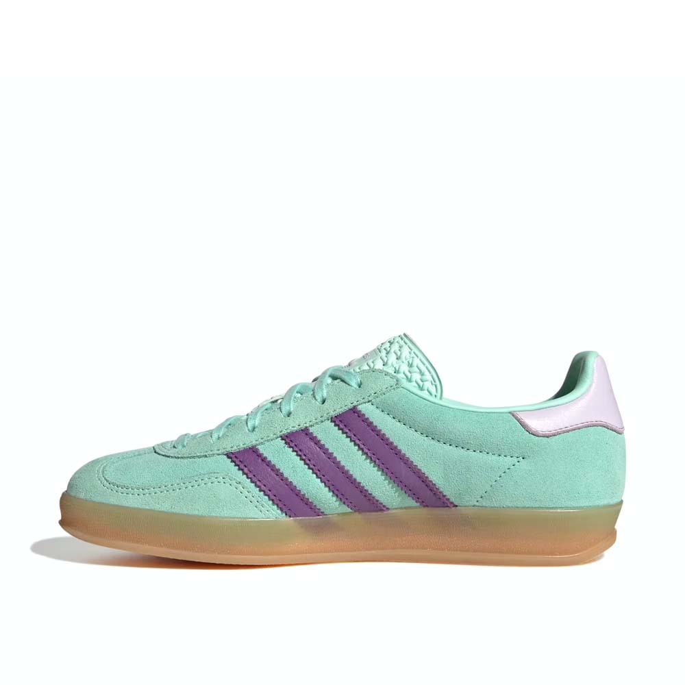 Az Adidas Gazelle Indoor Clear Mint a klasszikus adidas vonalak és a modern színvilág harmonikus találkozása. A cipő felsőrésze prémium nubukból készült, amely puha tapintású, ugyanakkor rendkívül tartós és elegáns. A Clear Mint árnyalat friss, tavaszias megjelenést kölcsönöz, míg az Active Purple és Ice Lavender részletek finoman kiemelik a modell játékos, nőies karakterét. Az aranyszínű „Gazelle” felirat és a klasszikus 3-csíkos dizájn hűen idézi az adidas hagyományait, miközben a modern színpaletta új életet lehel ebbe az ikonikus modellbe.