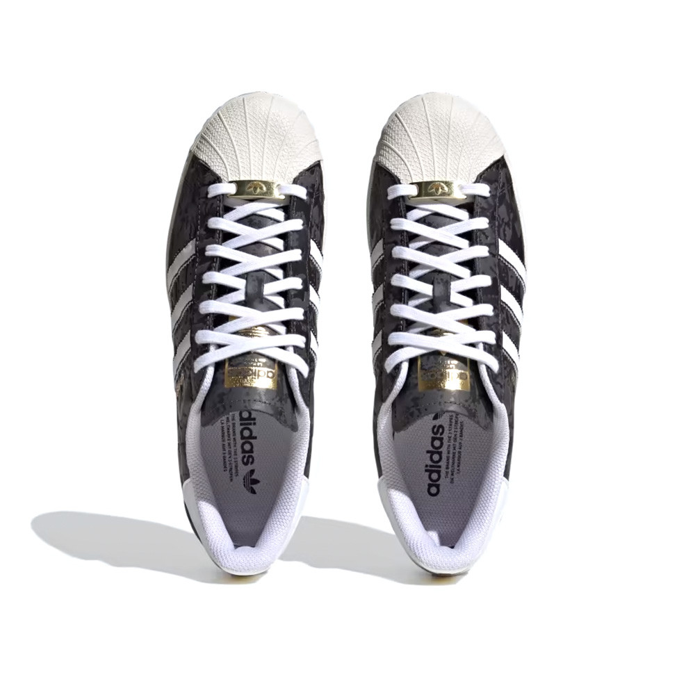Az Adidas Superstar 'Camo Black' felsőrésze prémium minőségű bőrből készült, amely tartósságot és elegáns megjelenést biztosít. A finoman kidolgozott részletek, mint a varrott három csík és a jellegzetes gumiorr, az Adidas klasszikus Superstar dizájnjának modern értelmezését nyújtják. A camo mintázat és az arany díszítések tovább növelik a cipő exkluzivitását, miközben megőrzik annak időtlen stílusát.