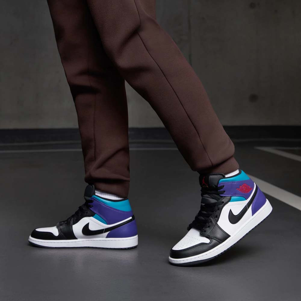 A Jordan 1 Mid Court Purple felsőrésze prémium bőrből készült, amely egyszerre biztosít tartósságot és stílusos megjelenést. A hófehér alapot mély Court Purple rétegek emelik ki, amelyeket a vibráló Tropical Twist (türkiz) részletek tesznek különlegessé. A piros Wings logó és a finom arany akcentusok még egyedibbé varázsolják a cipőt, kiemelve a modell különleges karakterét.