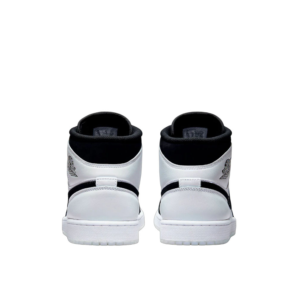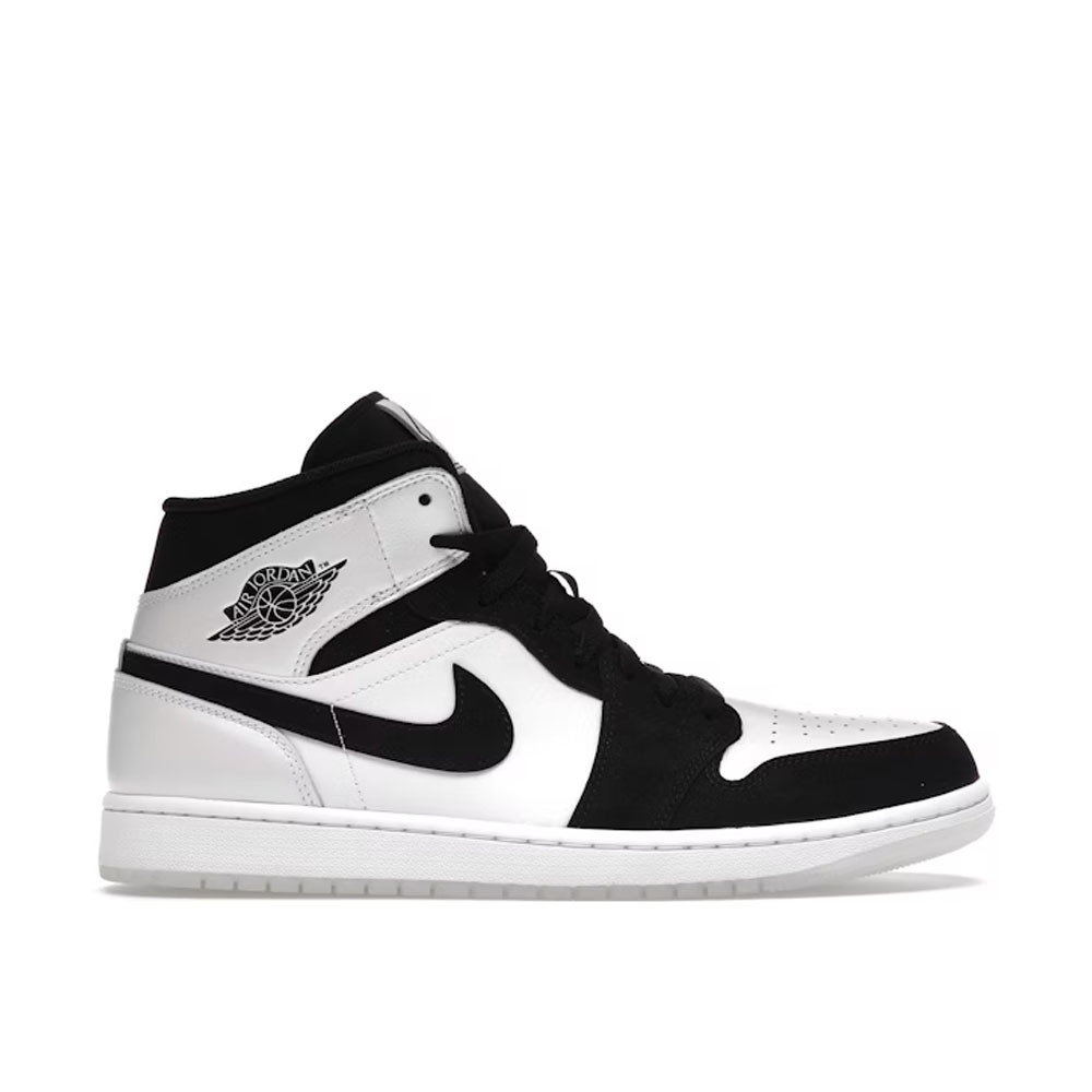A Jordan 1 Mid Diamond Shorts felsőrésze kiváló minőségű fehér bőrből és fekete Durabuck elemekből készült, amelyek tartósságot és kényelmet biztosítanak. A kontrasztos fekete-fehér megjelenés letisztult, mégis erőteljes hatást kelt, míg a nyelven elhelyezett Diamond logó különleges részletként teszi egyedivé a modellt.