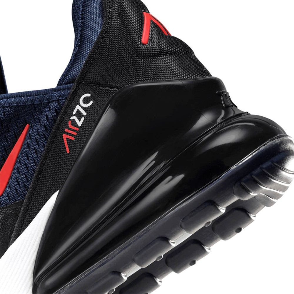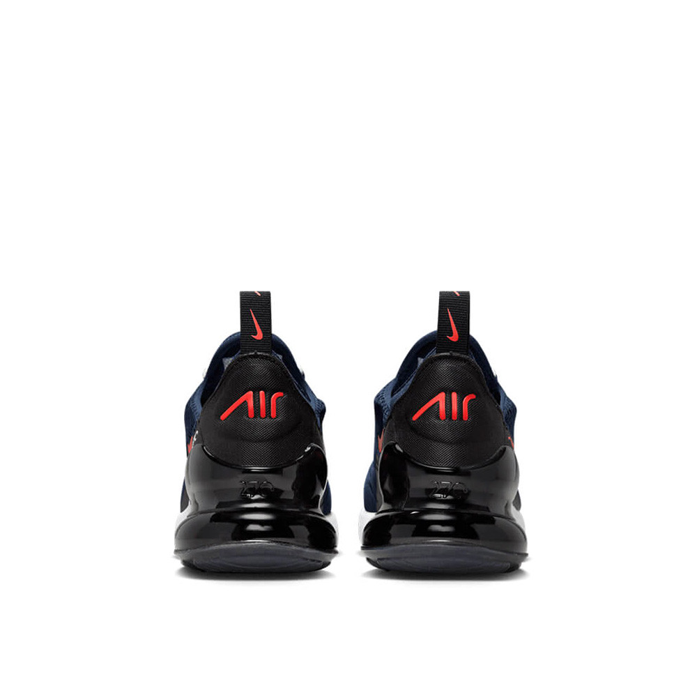 A cipő gumitalpának kialakítása kiemelkedő tapadást és stabilitást biztosít különböző felületeken. A mélyebb bordázat segít biztosítani a megbízható tapadást még esős időben is, miközben a masszív kialakítás a cipő sportos vonásait erősíti. Az Air Max 270 Midnight Navy talpa segíti a kényelmes és stabil mozgást bármilyen környezetben.