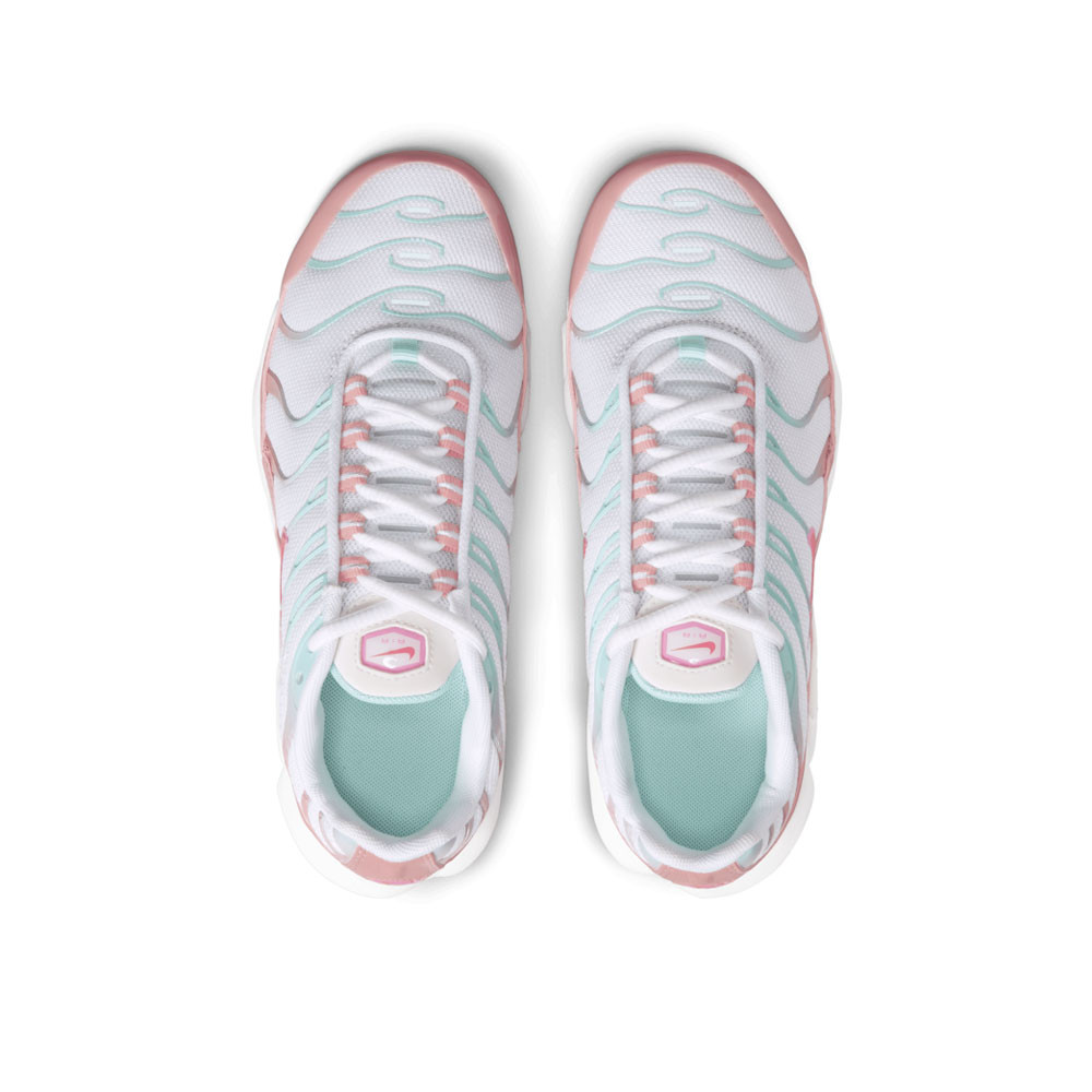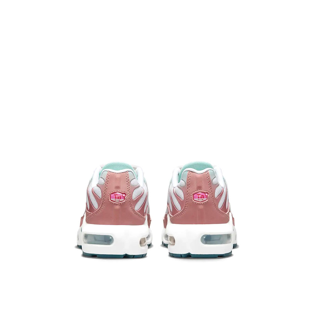 A Nike Air Max Plus GS White Red felsőrésze légáteresztő mesh anyagból és tartós TPU elemekből készült, amelyek egyszerre biztosítanak kényelmet, könnyedséget és stabilitást. A tiszta fehér mesh alapot élénk Red Stardust részletek egészítik ki, dinamikus, sportos megjelenést kölcsönözve a cipőnek. A precízen kialakított varrások és részletek emelik a modell prémium minőségét és vizuális karakterét.