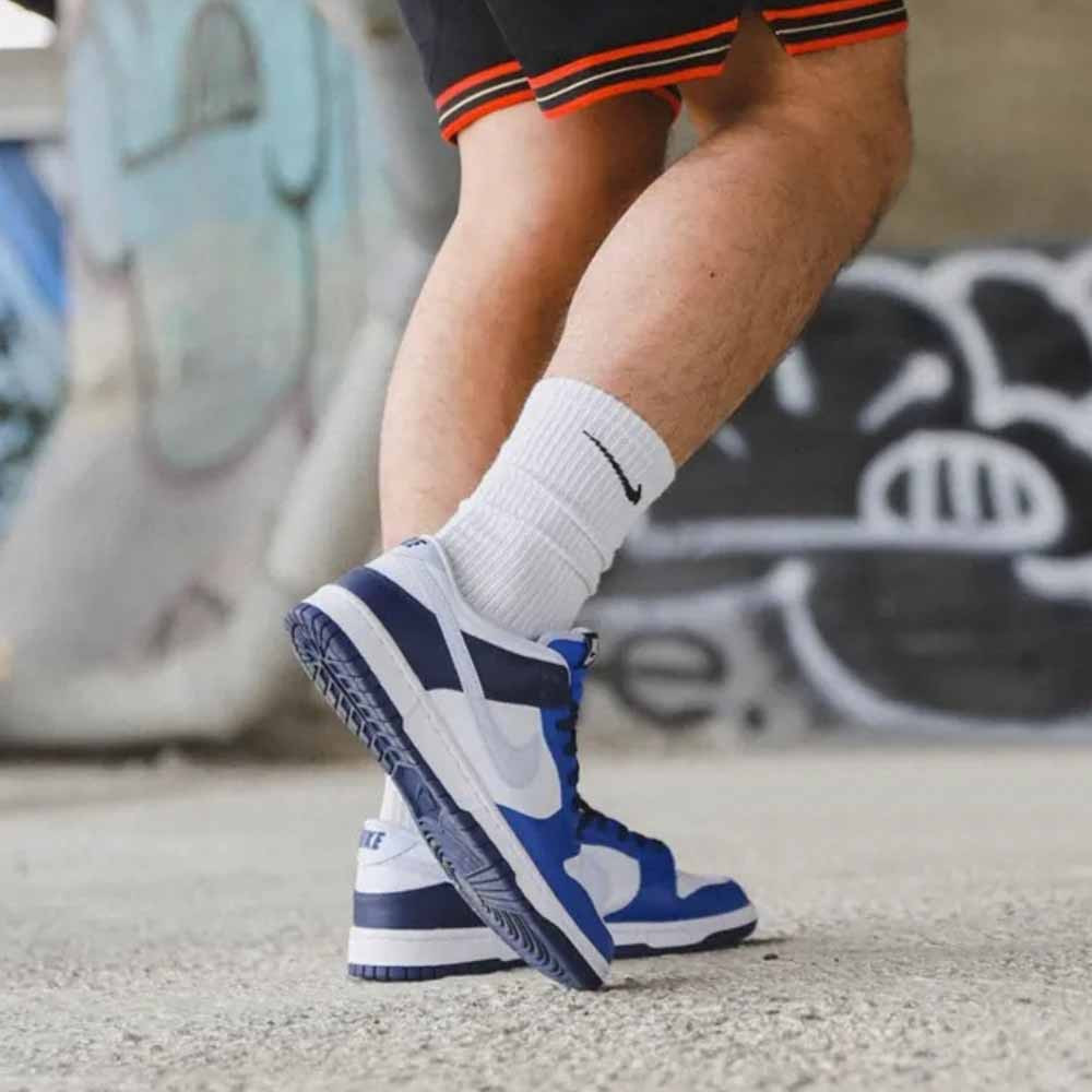 A fehér alapot élénk Game Royal és sötétebb navy kék részletek egészítik ki, amelyek klasszikus, sportos összhatást adnak. A színblokkolás kiemeli a Dunk Low formáját, miközben könnyen kombinálható farmerral, melegítővel vagy streetwear szettekkel. A megjelenés időtálló, nem követ gyorsan változó trendeket.