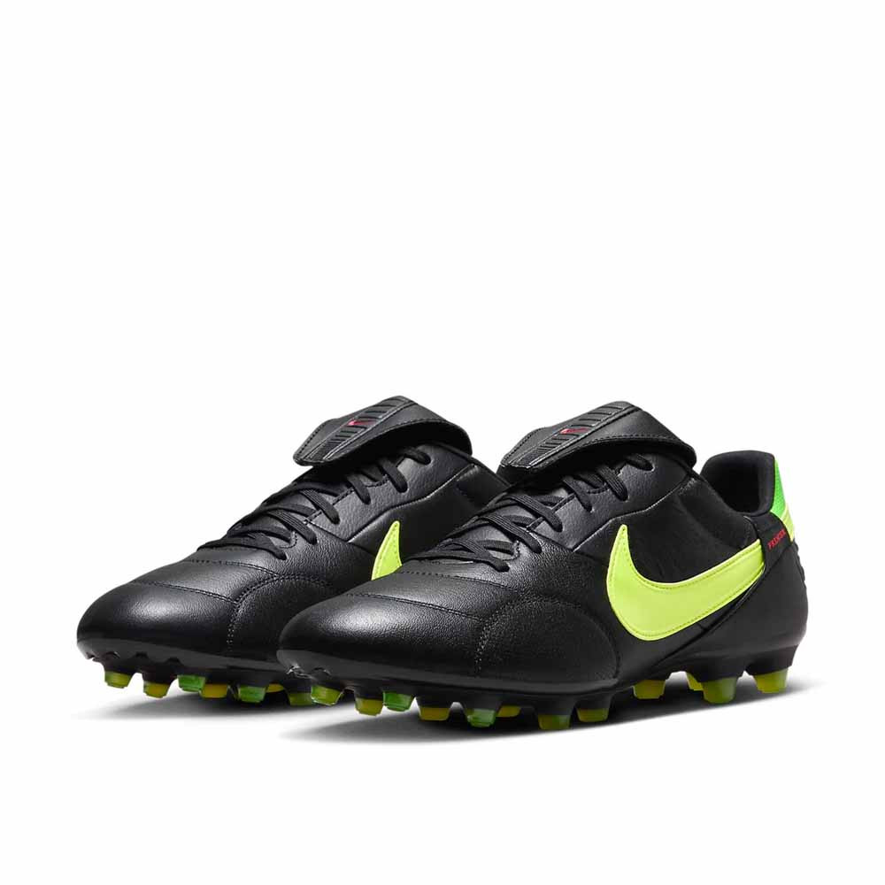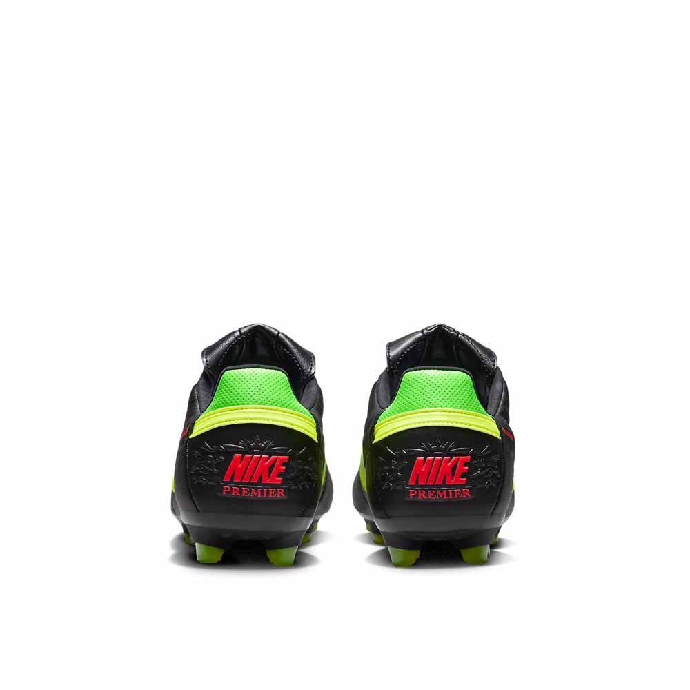 A Black Volt kiadás a minimalista fekete alapra épül, amelyet élénk neonzöld részletek törnek meg. Ez a kontraszt egyszerre visszafogott és energikus, jól illik a Premier sorozat klasszikus karakteréhez. A lehajtható nyelv a régi Nike futballcipők hangulatát idézi, miközben modern anyagokkal párosul. A dizájn minden korosztály számára könnyen viselhető, és jól mutat a pályán a letisztult formák miatt.